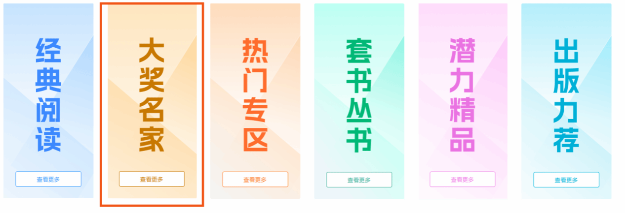板块主打“优中选精”,分别以经典、大奖名家、热门、套/丛书、潜力、出版力荐6个名目为分类依据,并以市场评价和图书阅读馆藏情况等作为甄选标准。