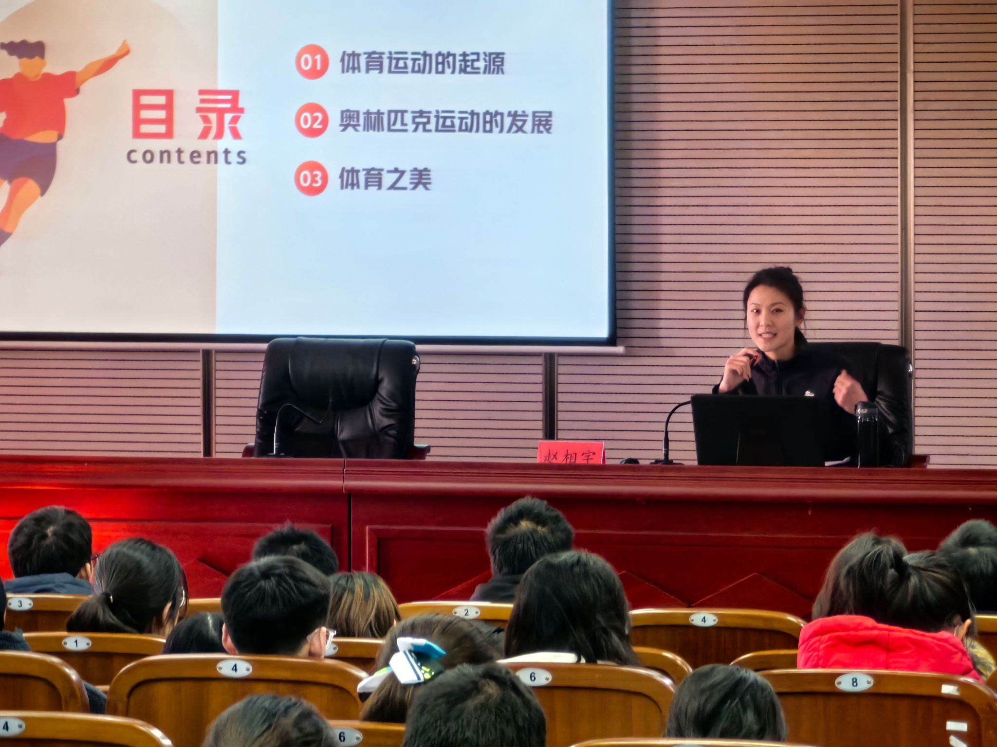 赵相宇从军事训练、宗教仪式、生产劳动、原始嬉戏与狩猎活动等场景生动形象地讲述了体育运动的起源,形象直观地向大家展示了奥林匹克运动会的发展历程与奥运五环的意义;从人体美、精神美、道德美、艺术美、和谐美、动态美、社会美和心灵美等角度展示了体育之美,指出体育精神的魅力就在于顽强拼搏、团结协作、永不言败。讲座期间,赵相宇老师还不时地与同学们进行互动交流。