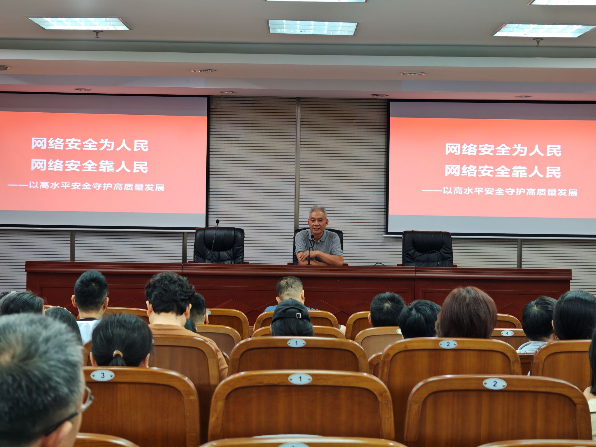 为进一步提升全馆工作人员网络安全意识,强化图书馆数字化服务安全保障能力,9月24日下午,图书馆在希望大道校区五楼报告厅,组织开展以“网络安全为人民 网络安全靠人民——以高水平安全守护高质量发展”为主题的国家网络安全宣传教育活动,党总支书记花爱军主持,全体职工参加。