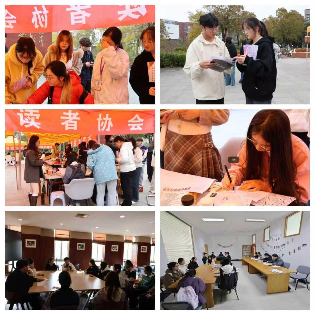 11月8日至9日,读者协会分别在希望大道校区铁军广场与建军东路校区体育馆广场组织线下招新活动。现场协会成员向同学发放读者协会招新宣传册,并结合自身经历介绍了协会日常运营、阅读分享会、图书馆志愿服务等。与会同学就参与方式、会员权益等问题进行了深入交流,现场共收集“读者协会招新报名表”300余份。