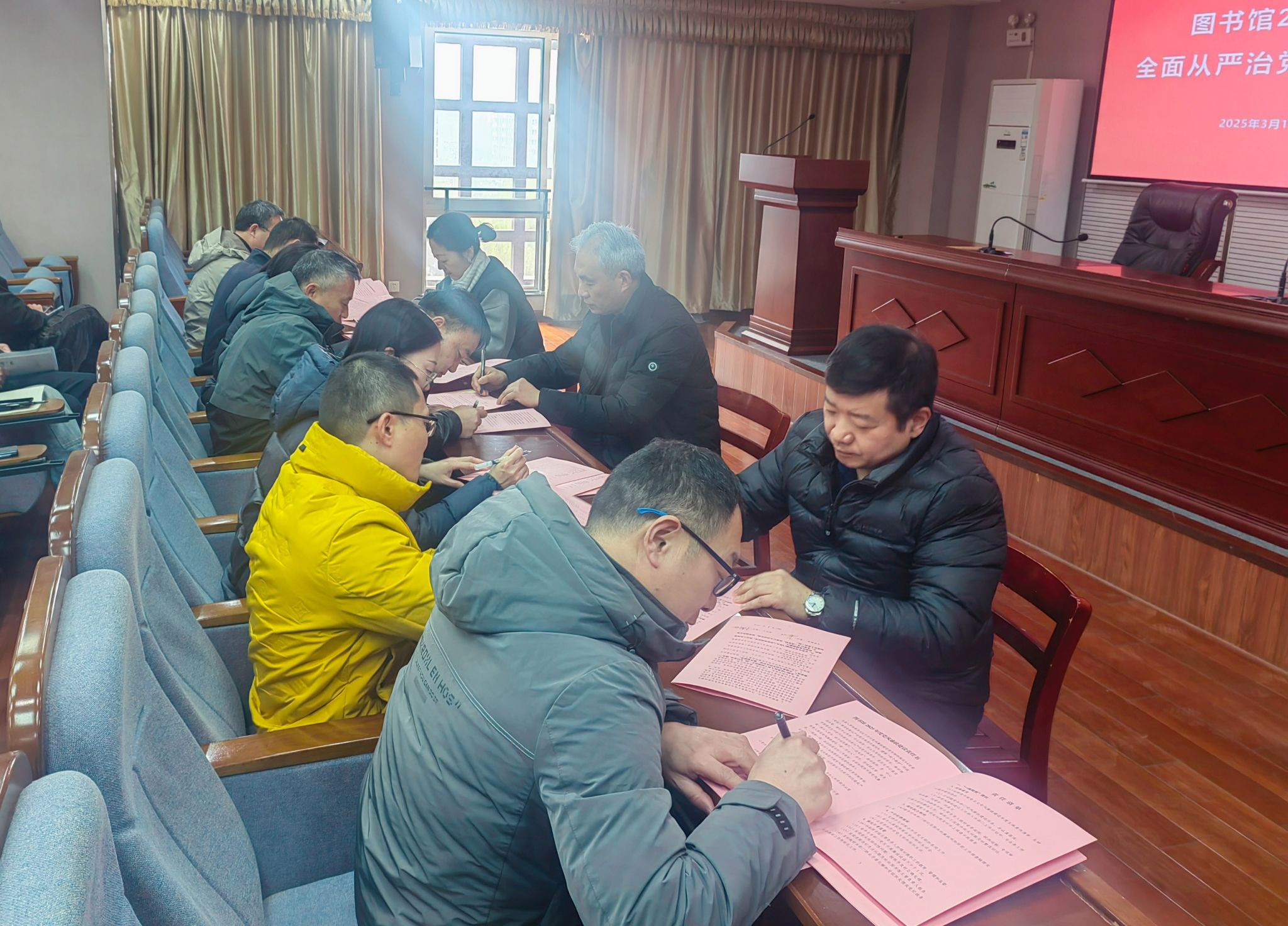 最后,图书馆领导班子成员分别与教工党支部及分管部室中心负责人签订了全面从严治党责任书、党风廉政建设责任书、意识形态政治安全工作责任书、安全稳定责任书。