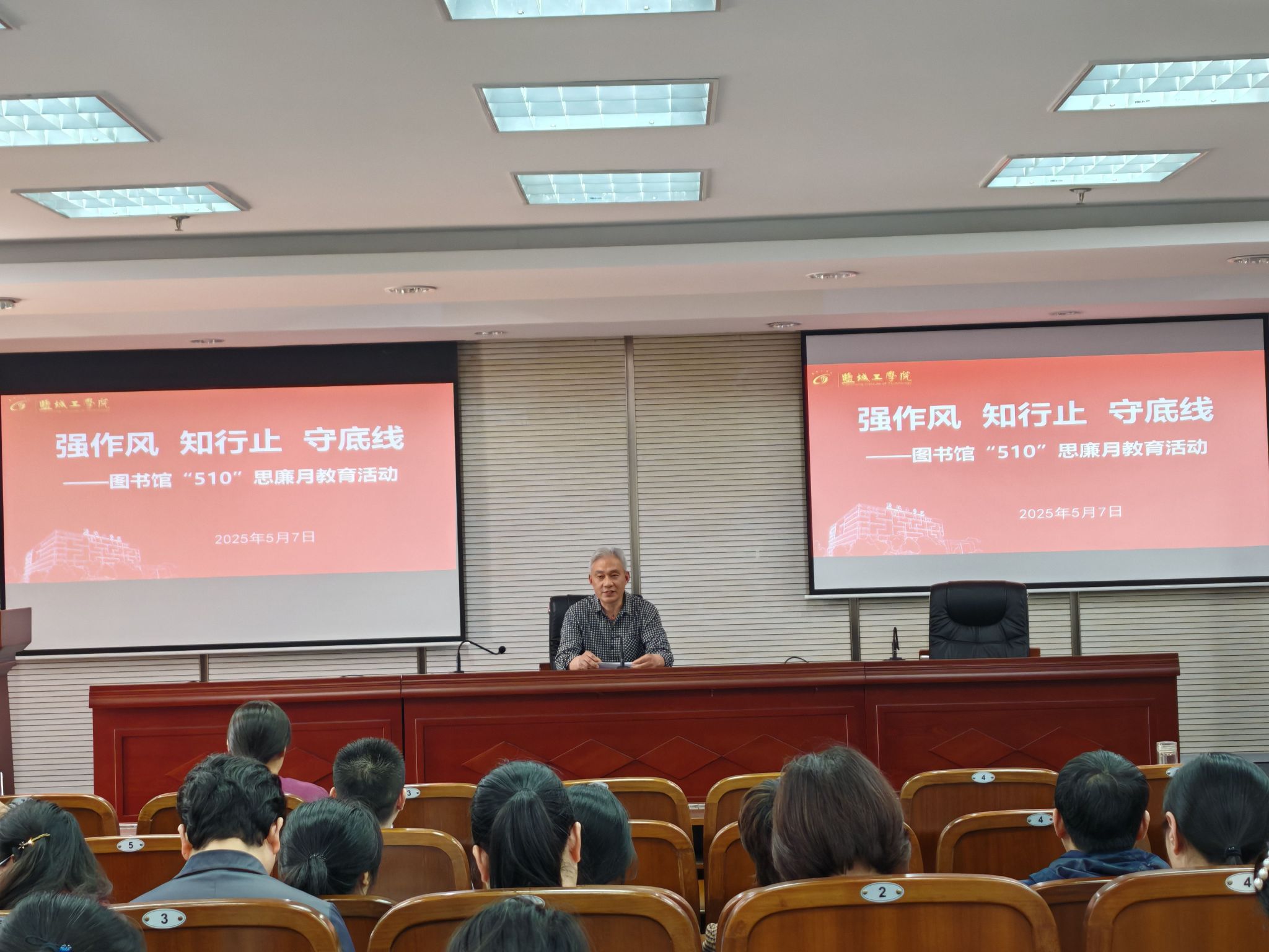 5月7日下午,在南校区图书馆五楼报告厅,图书馆党总支组织开展“510”思廉月警示教育活动,党总支书记花爱军主持,全体职工参加。