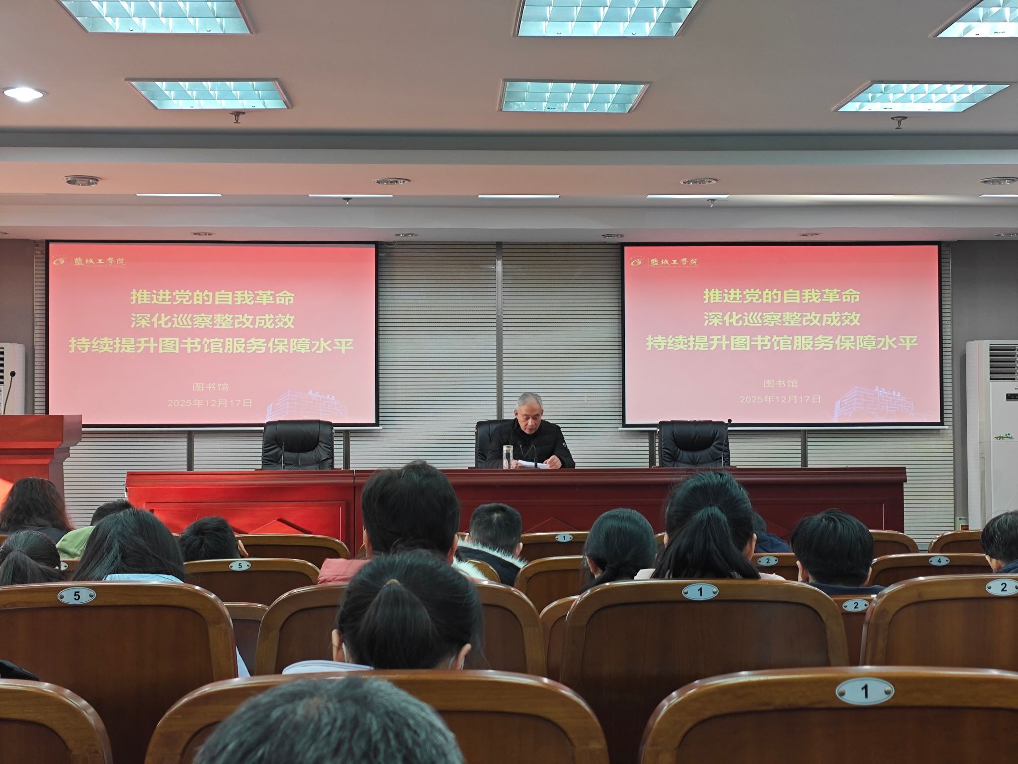 为深入践行党的自我革命重要思想,将巡察整改成果转化为服务高质量发展的强大动力,12月17日下午,图书馆在南校区五楼报告厅召开主题为“推进党的自我革命 深化巡察整改成效 持续提升图书馆服务保障水平”专题学习会,党总支书记花爱军主持,全体教职工参加。
