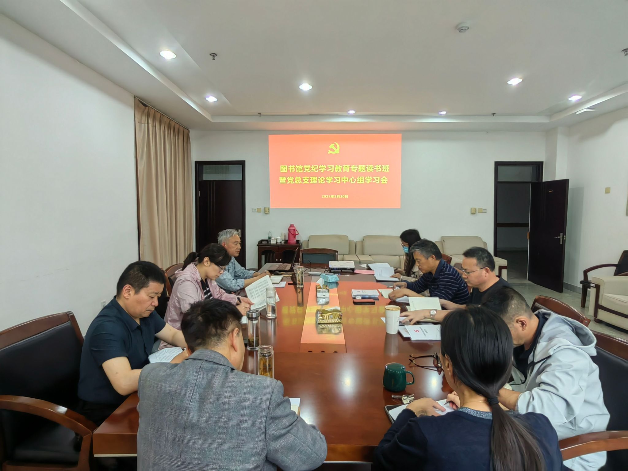5月30日下午,图书馆党总支在图书馆D805会议室开展理论学习中心组春学期第三次暨党纪教育专题读书班第二次集中学习。党总支书记花爱军主持,理论学习中心组全体成员参加。