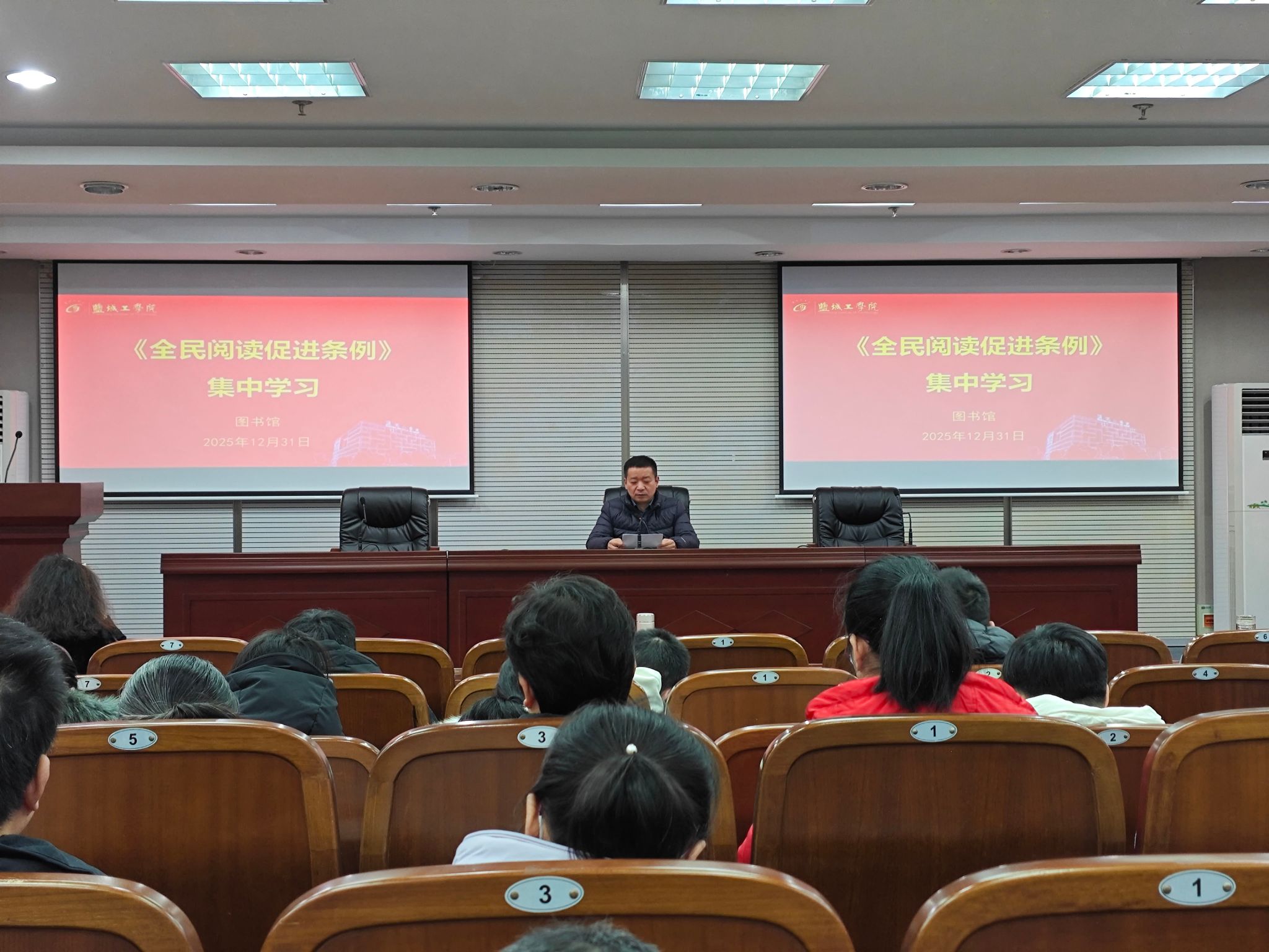 为深入贯彻落实国家关于全民阅读的战略部署,进一步提升图书馆服务效能,营造“爱读书、读好书、善读书”的浓厚氛围,12月31日下午,图书馆在南校区五楼报告厅组织开展《全民阅读促进条例》(以下简称《条例》)集中学习,党总支书记花爱军主持,全体教职工参加。