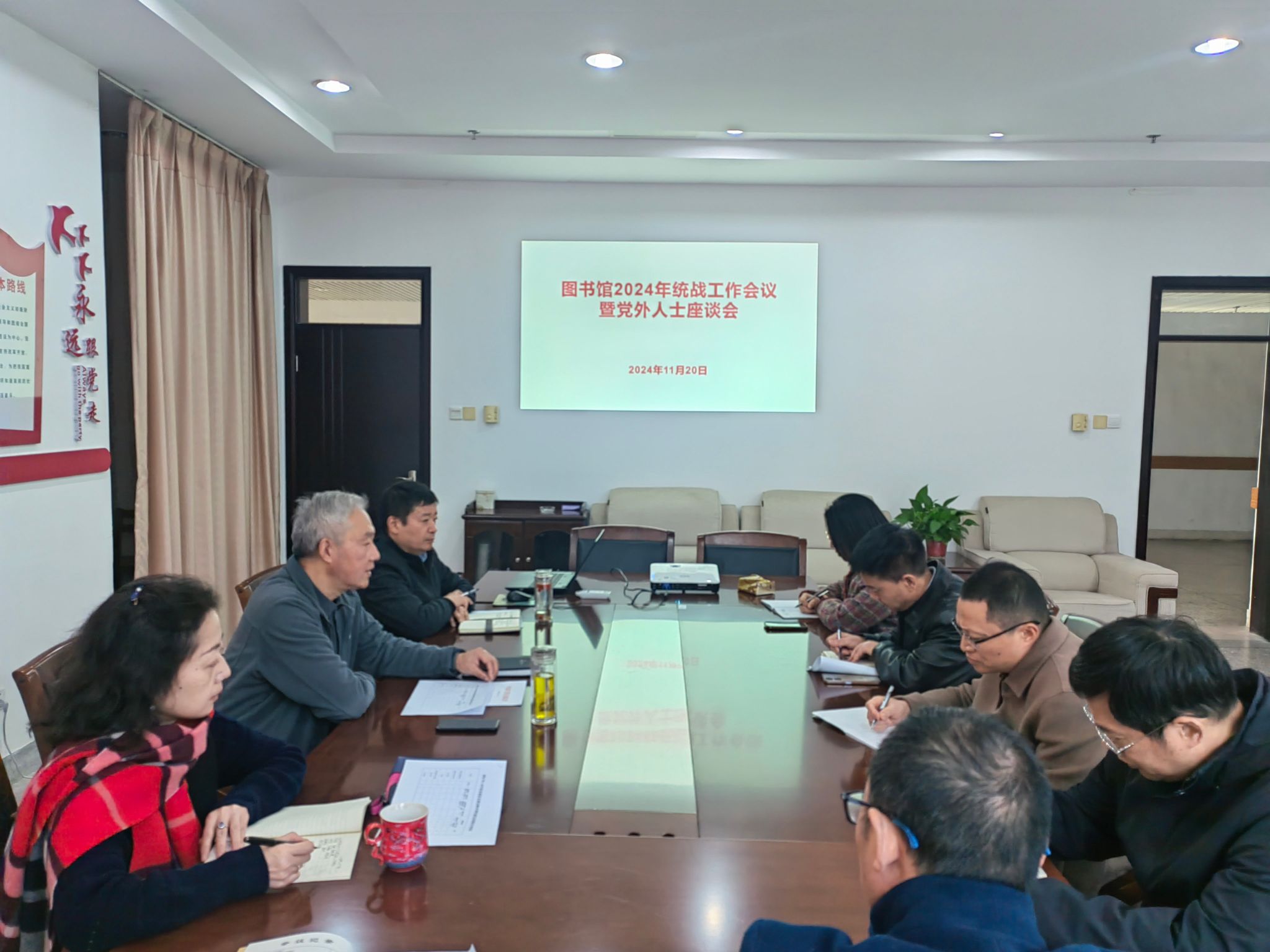 11月20日下午,图书馆召开2024年统战工作会议暨党外人士座谈会,就进一步密切党员领导干部与党外代表人士联谊交友,发挥党外人士在图书馆工作中的积极作用展开座谈。会议由图书馆党总支书记花爱军主持,图书馆党总支班子成员、民主党派人士参加。